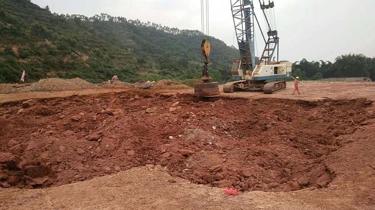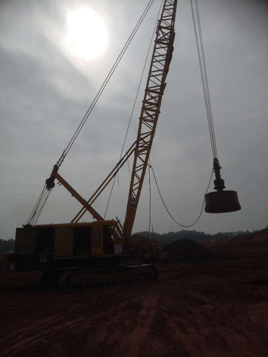 3、将夯锤起吊到预定高度,待夯锤脱钩自由下落后,放下吊钩,测量锤顶高程。若发现因坑底倾斜而造成夯锤歪斜时,及时将坑底整平。